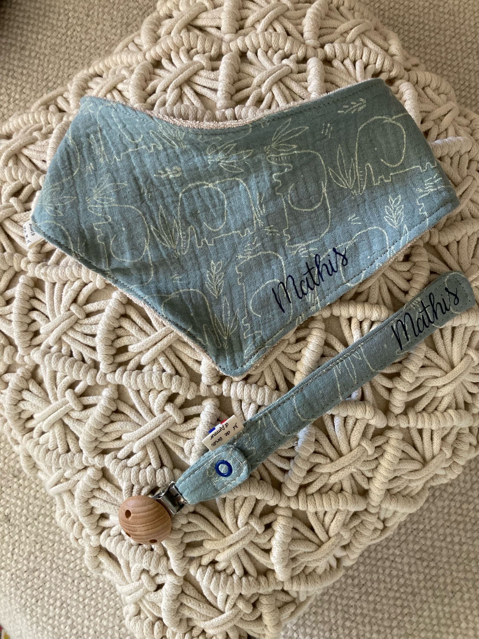 Le bavoir est imperméable, ce qui permet de garder les vêtements de bébé propres et secs. Il est doté d’une poche frontale et se ferme à l’arrière avec un scratch.